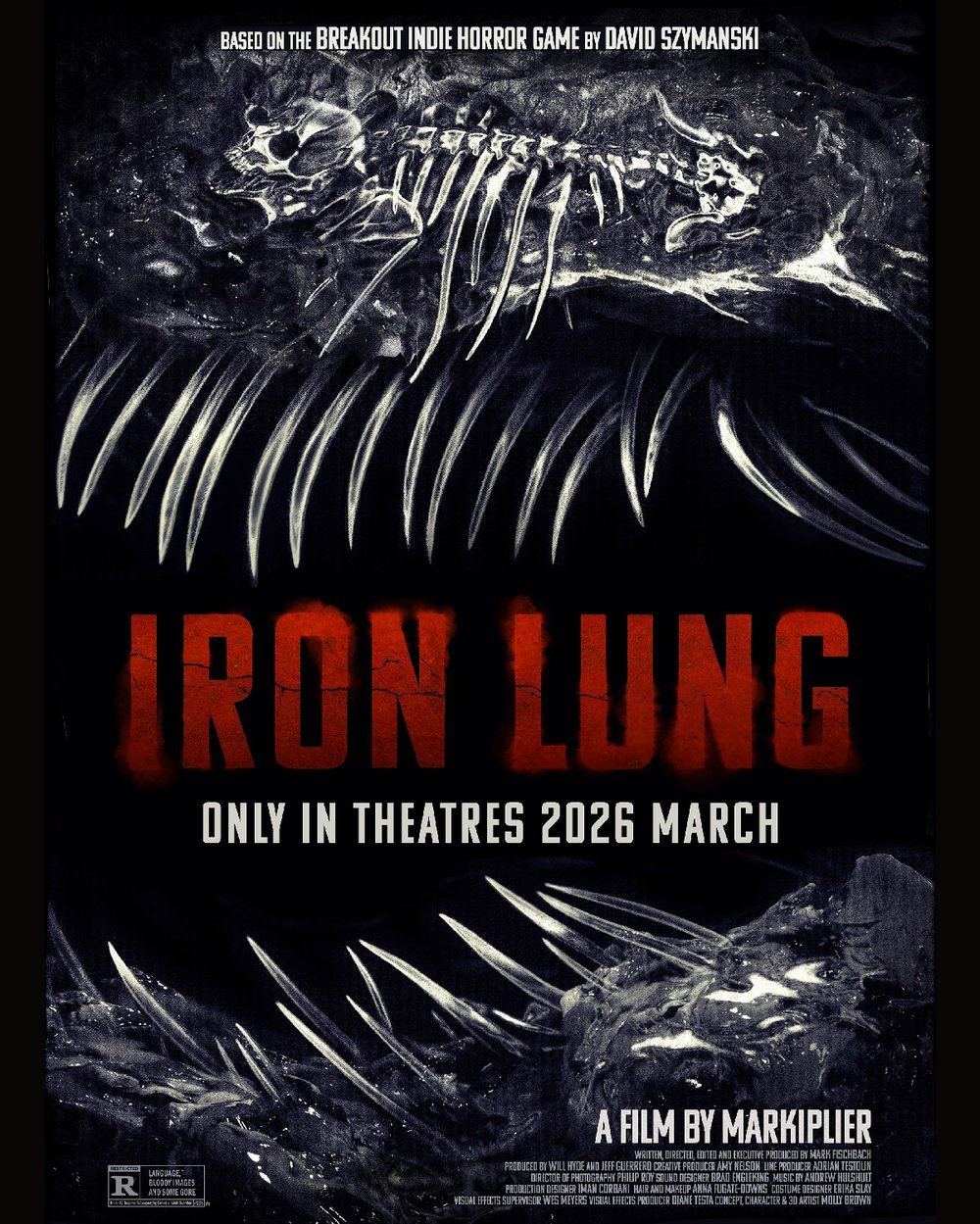 浩劫過後,宇宙恆星與宜居行星盡數消失,僅餘太空站倖存者掙扎求生。囚犯Simon被焊入殘破「鐵肺」潛艇,孤身駛入荒蕪衛星的血紅海洋,執行第十三次致命探險,追尋失落資源背後的宇宙之謎,面對無盡幽閉恐懼與未知威脅……鐵肺(Iron Lung)是一部恐怖、科幻片。